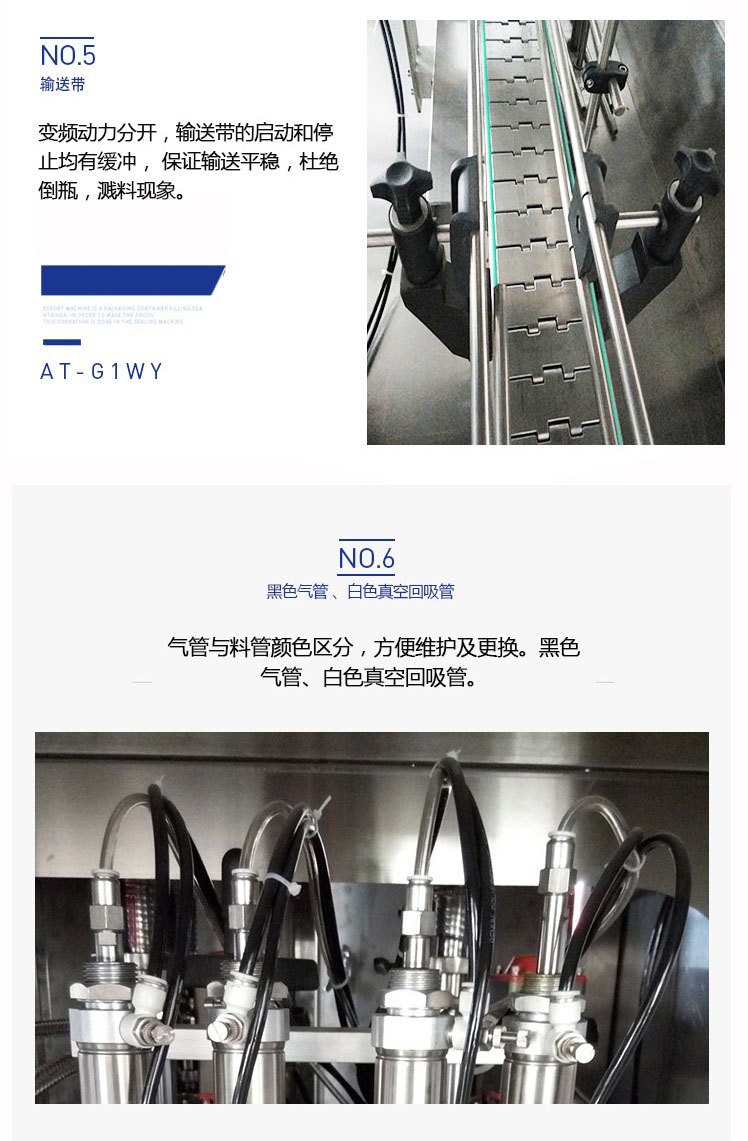 該六頭柱塞式全自動(dòng)潤(rùn)滑油灌裝機(jī)特的灌裝頭設(shè)計(jì)及真空回吸系統(tǒng),確保灌裝過程無殘油滴漏,快慢雙速灌裝,灌裝速度可調(diào),杜絕溢瓶現(xiàn)象。該機(jī)采用動(dòng)力灌裝,無需配裝高位罐,簡(jiǎn)化了安裝工序,提高了灌裝效率。履帶式壓蓋機(jī),穩(wěn)定無噪音,無空壓現(xiàn)象。觸摸屏界面友好,操作簡(jiǎn)捷,SIEMENS PLC控制系統(tǒng),運(yùn)算速度快,性能穩(wěn)定,品質(zhì)卓越。電、氣件均采用精品元件,確保整機(jī)運(yùn)作穩(wěn)定。