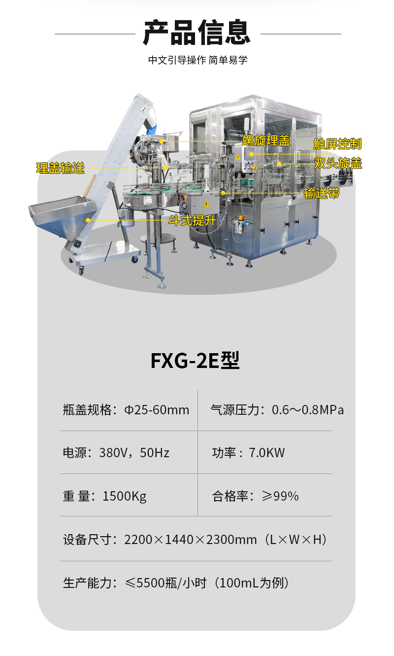 FXG-2E型全自動(dòng)雙頭跟隨式旋蓋機(jī)由理蓋輸蓋機(jī)構(gòu)、抓蓋旋蓋機(jī)構(gòu)、運(yùn)動(dòng)模塊、輸送機(jī)構(gòu)及控制系統(tǒng)組成。整機(jī)結(jié)構(gòu)簡單、調(diào)整方便。該設(shè)備為我司新研制,產(chǎn)品在移動(dòng)過程中,完成旋蓋動(dòng)作。區(qū)別于常規(guī)旋蓋機(jī),在旋蓋時(shí)需要停頓,會(huì)使物料晃出瓶口,污染瓶身。該機(jī)旋蓋不停頓,有效的避免了旋蓋停頓晃液,保持瓶身清潔。