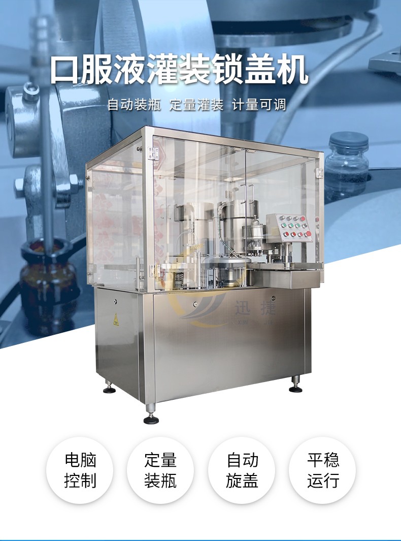 全自動(dòng)口服液灌裝鎖蓋機(jī)適用于多種規(guī)格的口服液糖漿瓶灌裝軋蓋。自動(dòng)完成進(jìn)瓶、理瓶、灌裝、宋改、軋蓋出瓶等多種工藝。