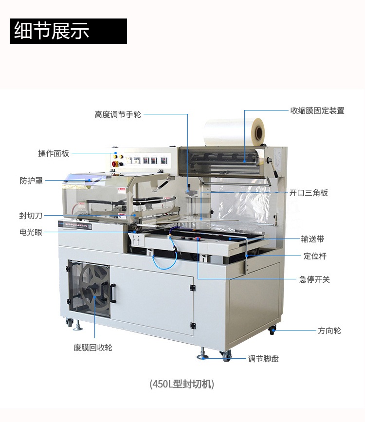配合L型封切刀使收縮膜包裝一次封切成型,鍍特氟龍不粘層封口布,封切不黏膜,且封口整齊不開裂,產(chǎn)品經(jīng)封切后,進入自動塑料膜熱收縮包裝機完成包裝。