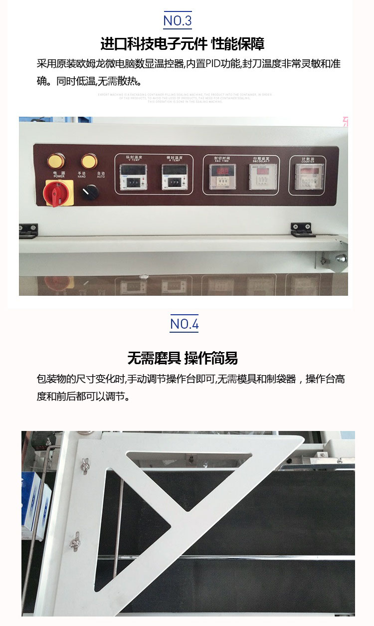 采用國際先進控制元件;封刀采用特殊設(shè)計,封口牢固、不開裂、不粘刀;