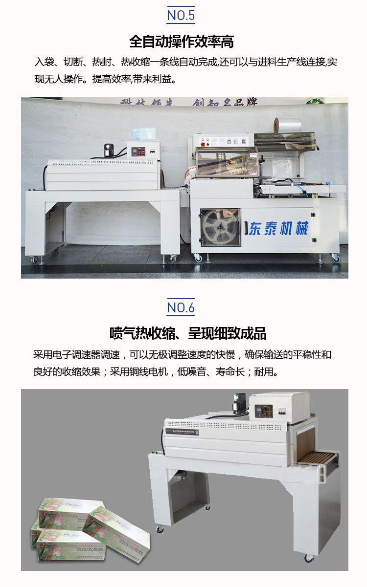 自動塑料膜熱收縮包裝機結(jié)構(gòu)緊湊占地面積小,非常適合配套自動包裝流水線完成產(chǎn)品的自動無人化包裝,適合于單個物品包裝或有底托物品包裝。自動送膜打孔裝置和手動調(diào)節(jié)的導(dǎo)膜系統(tǒng)以及手動調(diào)節(jié)的進料輸送平臺,可適于不同寬度和高度的產(chǎn)品,實現(xiàn)一臺機器滿足各種尺寸的包裝物品。